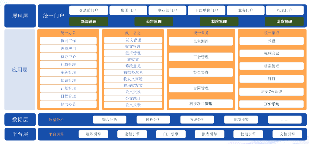 - 统一门户:集成兼容多业务系统,形成统一业务门户,统一应用入口实现多业务系统在PC端、移动端的操作。