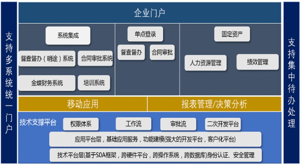 3. 办公工作门户,实现集团总部、各下属单位办公工作门户,各单位可独立配置所需内容。实现事项、消息、公共信息等的集中呈现。