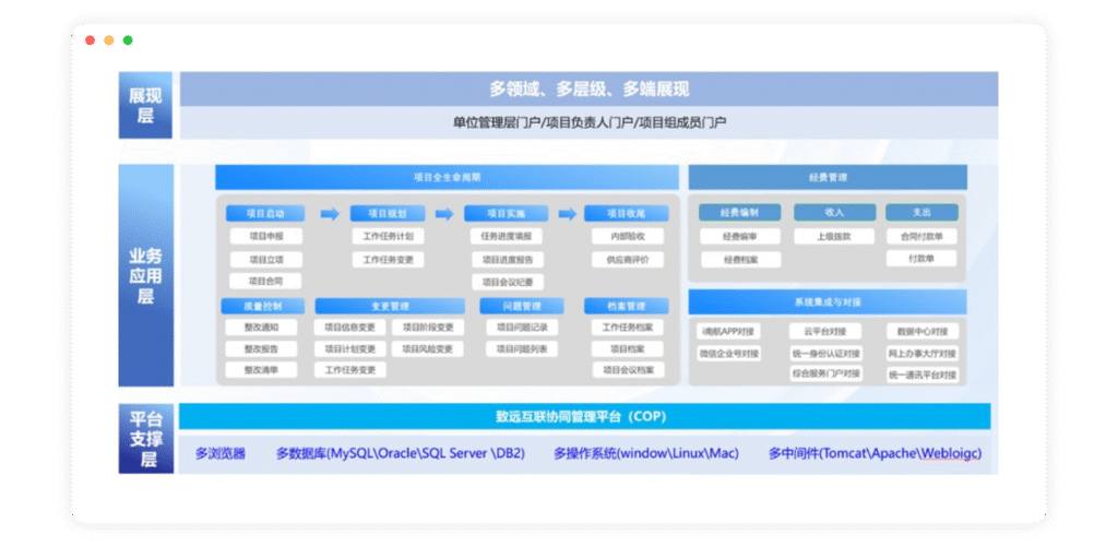 - 提高过程监管能力:对已建成和建设中的项目进行统一的系统化管理,可以随时查看各项工作的执行进度,跟踪项目执行过程中问题,把控项目过程中的风险。