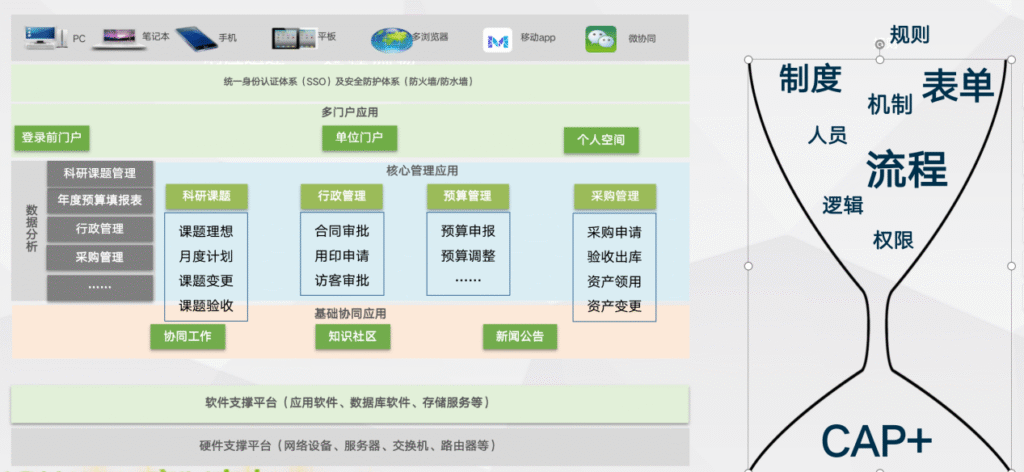期智研究院属于新近成立的专业领域研究机构,其内部管理信息系统存在较大的空白,对于内部管理平台需求的表述为:不要有信息孤岛,不要有任何业务上的漏点,所有工作都要阳光,在系统中管理者可以看得到;任何一个概念,只能对应一个数据,而且在系统中只能录入一次,其他需要使用的部门信息共享,减少重复填报,提升内部管理效率。