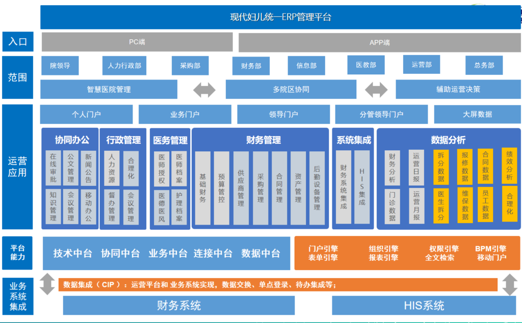 海南现代妇女儿童医院协同运营平台上线,该平台集薪酬、绩效、基础人事、招聘、考勤、合同、采购、预算、资产、设备、医务、财务、运营BI 分析等业务系统,实现三甲医疗行业首家采用全业态协同运营平台。