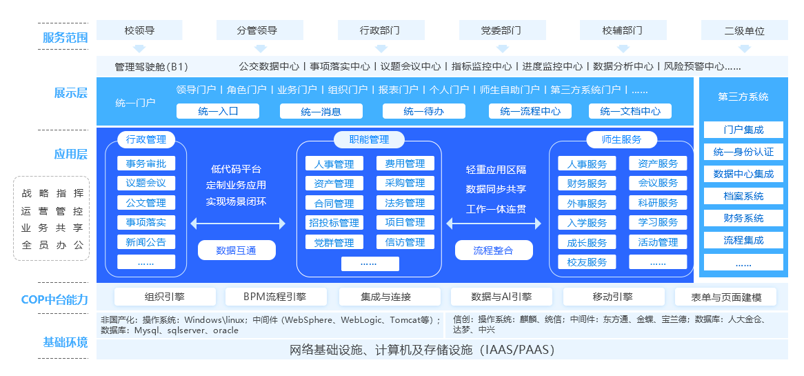 La piattaforma, integrando i sistemi operativi in diversi ambiti quali didattica, ricerca, risorse umane, finanza, gestione patrimoniale, logistica e gestione studenti, consente l’interoperabilità dei dati, la sinergia dei processi e la condivisione delle risorse. Ciò si traduce in una maggiore efficienza nella collaborazione inter-dipartimentale e in un miglioramento del livello scientifico dei processi decisionali, contribuendo a raggiungere una gestione di precisione, servizi intelligenti e sviluppo sostenibile, offrendo un solido supporto informatico per la costruzione di atenei moderni e di alto livello.